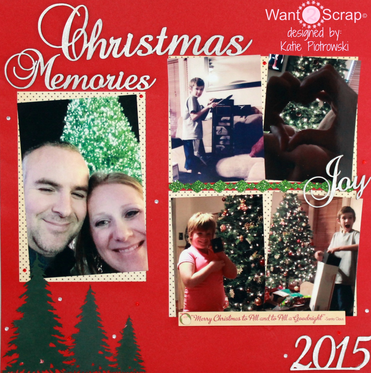 I added a polka dot patterned paper behind the overlay to add a touch of color without overwhelming the page. After printing the photos with my Selphy I adhered them into place. In the lower left hand corner I added the Want2Scrap Pine Trees - Set of 3. To create the title and subtitle, I used the Want2Scrap Christmas Fancy Chipboard Word, Want2Scrap Memories Fancy Chipboard Word, Want2Scrap Joy Fancy Chipboard Word and Want2Scrap 2015 Fancy Chipboard Word, all colored with a metallic silver Sharpie. To add more color and help break up the photo blocks I added a strip of the Want2Scrap Christmas Season Glitter Decorative Strips. To finish off the layout, I sprinkled some of the smallest gems from the Want2Scrap 72 Count Silver/Clear Rhinestone pack and some Want2Scrap Baby Bling in red around the page.