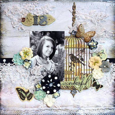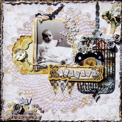 I used a photo of my mum, not sure how old she was and tried to pull the yellow colour from the papers by using the Theresa Collins packing. I sanded off the printed contents and thought it worked it beautifully with the page. I also spritzed the applique with glimmer mist to blend. The bird cage was an awesome accent to work with but I didn't want to lose it by cover my photo with it so I opted to use it this way instead.