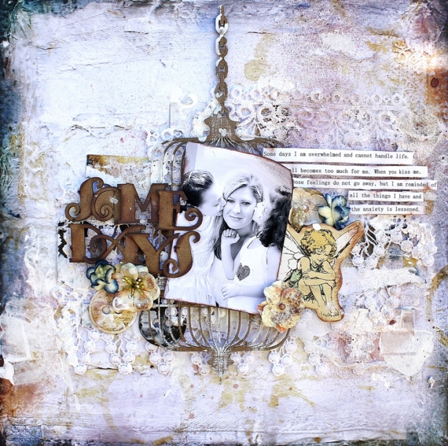 -I used the lace trim that came in the kit, together with torn pieces of paper to overlap them and create an interesting background with gesso. This adds texture and depth.