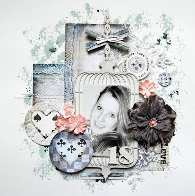 I used a photo of my mum, not sure how old she was and tried to pull the yellow colour from the papers by using the Theresa Collins packing. I sanded off the printed contents and thought it worked it beautifully with the page. I also spritzed the applique with glimmer mist to blend. The bird cage was an awesome accent to work with but I didn't want to lose it by cover my photo with it so I opted to use it this way instead.