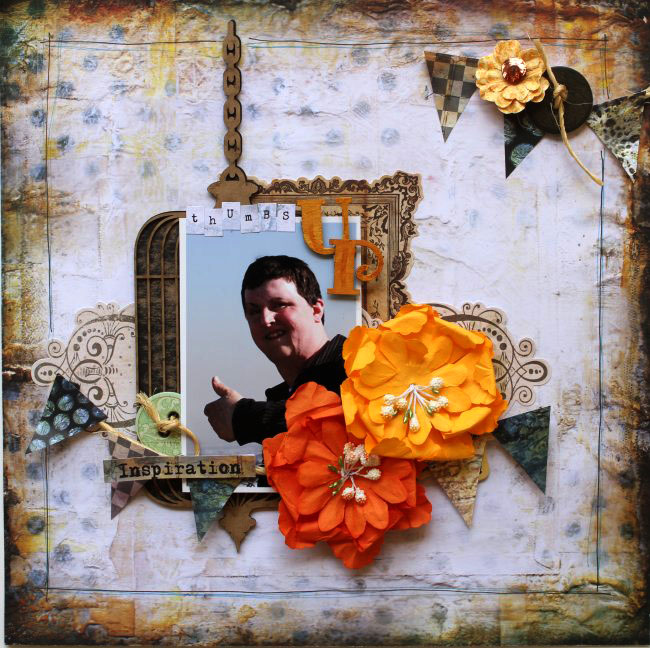I wanted to try out a new lens recently and focused on this little bird that looks like he's singing. I decided to base the colors on the layout based on the little bit of orange in his feathers. The white Teresa Collins flower was a little larger than I wanted, so I used Beverly's tip to remove a few layers. I zapped it with my heat gun, which made it easy to remove some of the bottom layers. I also made the Manor House orange flower smaller by removing the bottom two layers. I painted the birdhouse using some gold paint.