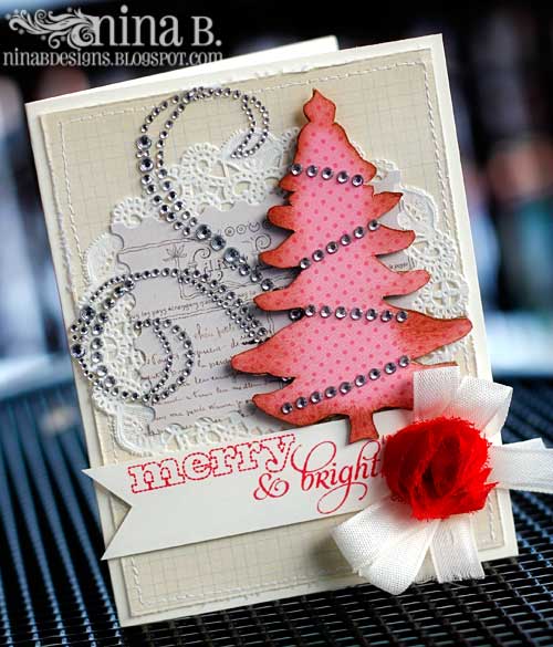 Nina here on the Want2Scrap blog with a fancy Christmas card to share with you all. I first distressed and stitched the edges of the Melissa Frances patterned paper, then laid a pretty doily right in the center. I adhered a sticker in the center of the doily and some beautiful B.Y.O.B. 1 Build your own Bling - Donna Salazar Design bling.