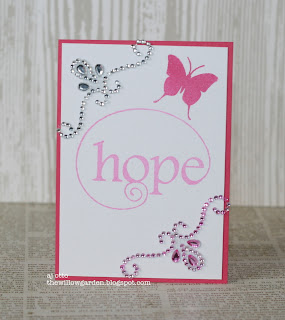 For my first ATC, I used the Paper Smooches set Hope. It's one of my favorite sets because it has the saying "Fight like a girl". To create my atc, I stamped the sentiment block in grey ink, then stamped the ribbon and "hope" on top. I added a portion of the Funky Swirls White pearls beneath the hope. (*I often cut up my swirls for smaller pieces, and in this case a Nestabling also.)
