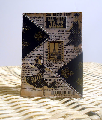 How about a little jazz bling style with "All That Jazz", this is the second ATC in my collection for a good cause. For this blinged out ATC I used Want2Scrap© Nestabling™ Classic Diamonds Silver Rhinestones and cut them to fit my Gold and Black Fleur de Lis pattern paper by The Robin's Nest. I used Want2Scrap© Designer Embellies ATC Chipboard and adhered using Beacon Adhesives Zip Dry Newsprint pattern paper by The Robin's Nest. I inked up the edges of the ATC with Clearsnaps Fluid Chalk Chestnut Roan and to add the final embellishments I hand trimmed pieces from the Graphic 45 Curtain Call collection of pattern paper.
